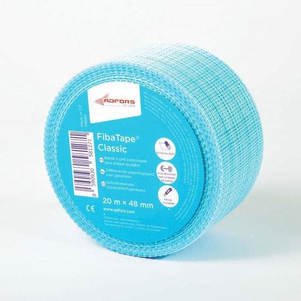 Bande à joint autocollante classique pour plaque de plâtre. Application facile, résistance mécanique élevée, grille en fibre de verre pour des joints plus solides.